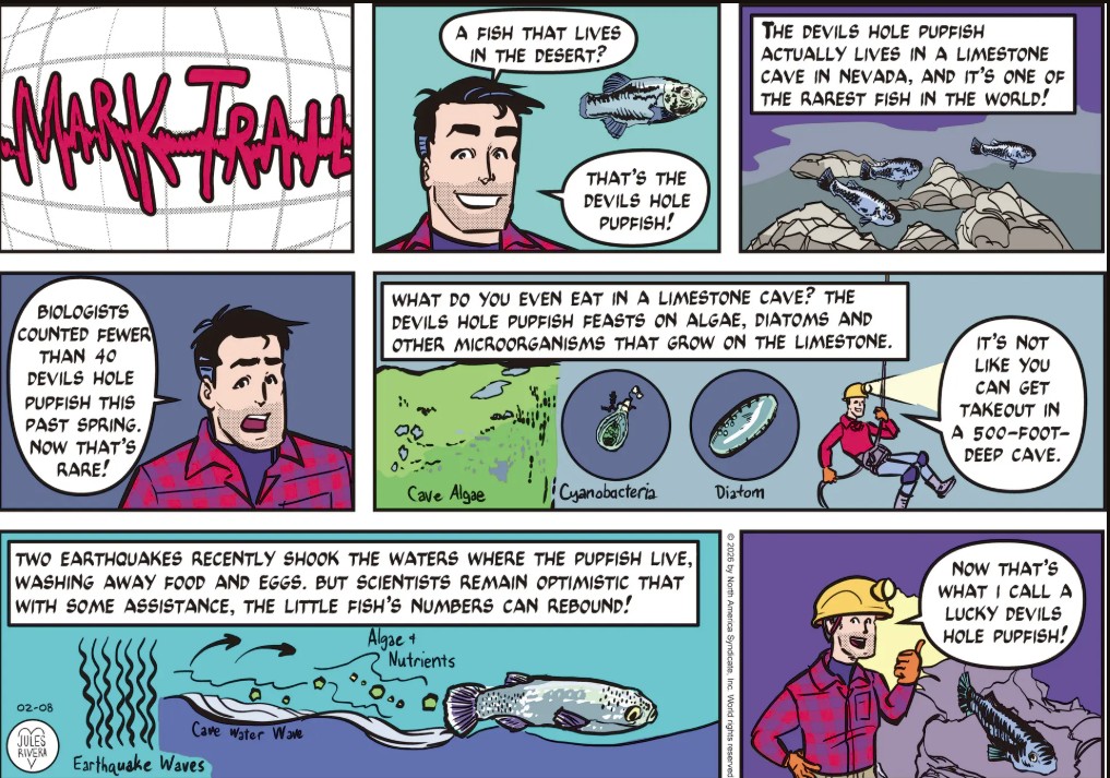 Let’s get into the story. Jules Rivera omitted the conclusion of yesterday’s face-off, so we’ll never know if the security guard was as reluctant to get involved as he looked, or if the Grungey Boys wanted to avoid the law and so quickly left. It seemed like it would have been a good opportunity for Rivera to get in some cheap laughs. Today we learned the likely reason why Cliff didn’t back up Mark against the Grungey Boys (panel 2). Does Mark think Cliff’s memory isn’t very good or did he forget Cliff’s own involvement in that doomed fishing class he mentions in panel 3? It might have produced a more effective panel to have Mark start off reminding Cliff of Connor’s accident and then show Cliff jumping in to finish the rest of the explanation, demonstrating that he did remember. A more dynamic panel results, though it would mean getting rid of the narration box.