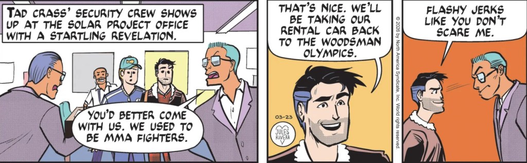 The storyline is not really whether there are other possible sites that could be used. It is who gets this site. The outcome on that is not in doubt, of course. Well, it would be significant if Tad Crass won in the end, meaning Mark Trail lost. Yeah, it would take a lot of guts for Jules Rivera to write that kind of story; but it would make an instructive, teachable moment to explore how Mark deals with defeat. It could even give Rivera’s incarnation of the Mark Trail adventure strip a much needed integrity boost by exposing its lead character as not the invincible, all-wins-and-no-losses guy he is presented as.