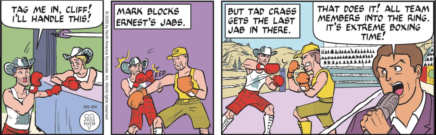 Mark could be more consistent. Bluebirds are cool! Bluebirds are not cool because they drop down on their prey. Which is it!? I’m nitpicking, because I think these Sunday strips would be better if more space was spent on the subject and less space on Mark and his puns. Not needed, Jules! My unsolicited recommendation is to go with the old standard: Limit Mark’s appearances to only the first information panel and maybe the last panel. Mark delivers only one joke (okay, Mark’s line in the last panel wasn’t bad). Also, keep doing the custom title panels!