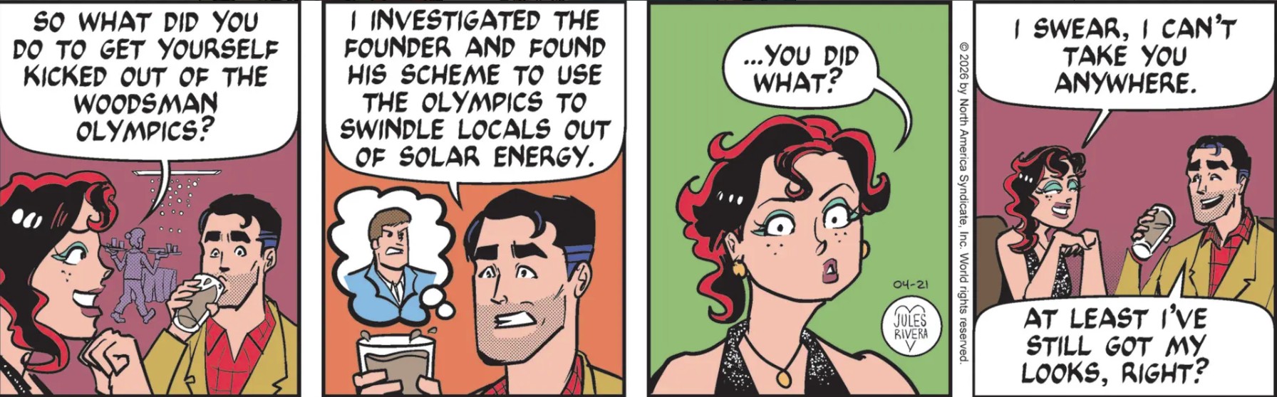 Also, I’m struck by how indifferent Tad Crass is to the current status of his Woodsman Olympics. We haven’t seen any referees, judges, or assistants, though we must assume those people exist. You wouldn’t know it, however. Still, we have to remember that this is a modern comic strip; not a novel. So Rivera is more or less forced into making broad statements about things. But she could have done more.