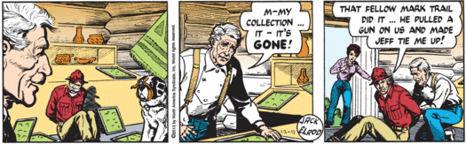 …and yet, all Mark can seem to think about is the location of “those artifacts.” Otherwise, this whole thing will have been for naught. Like a terrier on a bone, this guy is… even in the face of certain death, he can only think of that which is driving the plot line. Because really, does anyone think that Mark is actually in mortal danger here? I mean, the strip is named ‘Mark Trail’ after all… But even as we manufacture some tension, the mind still races as to how Mark gains the upper hand… does he put the canoe up on his shoulders and then do a 360, taking Jeff out? He can’t kill Jeff, since he knows where the loot is hidden. Oh, such a conundrum…