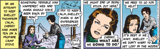 Love that Shelley still appears to be clutching her kerchief in her right hand while being waited on hand and foot… That’s the spirit! And never mind that Old Wes and is new best friend Mark are out there in Heaven knows what predicament… “We might end up getting STUCK OUT HERE! I may never get a signal on my phone ever again! I will never again tweet! Or find out if Kanye returns to Kim!” The strategic head tilt in Panel two yields to the uncomely furrowed brow of panel three, as Shelley is now being driven to take off in search of help!