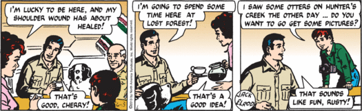 Yes, Mark, that’s right, Otters ARE “carefree little creatures…” Until of course we discover that they are missing! Didn’t show for their curtain call?!? What nerve! Don’t they realize that we are on a timetable here, that part of the bargain with respect to living in the Trailverse is to appear and perform on command? Even for the misshapen little ward with the camera?? Love the cowlick on top of Rusty’s head… doesn’t it just make you want to squeeze him??