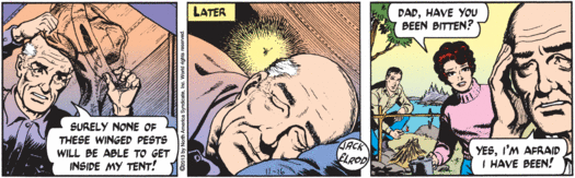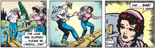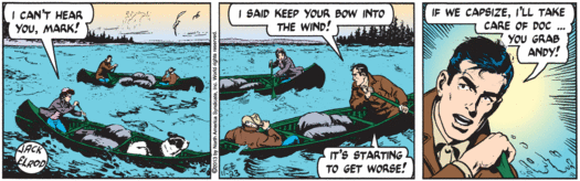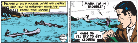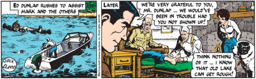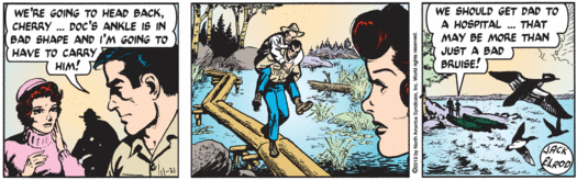So “Mark and the Others” head out. Would it have taken so much more effort and ink and space to actually call them out by name? I guess. After all, this strip is called MARK Trail, NOT Cherry, NOT Doc, NOT Rusty. Sort of reminds me of the early Gilligan’s Island song lyrics that did not call out the “Professor and Mary Ann” until later and referred to them only as “and the rest” (are here on Gilligan’s Island…) trivia time- sung by whom? The Wellingtons, of course.