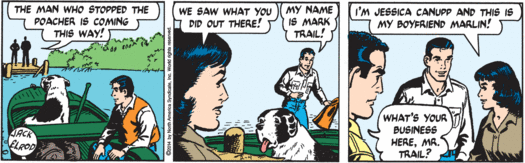 Well, I guess the guy with the spear was no more than a plot device allowing Marlin and Jessica to get to know Mark Trail before he properly introduces himself… Which he does straight away- without so much as being asked. “My name is Mark Trail,” he offers, unsolicited… Almost as if he has a string to pull out of his back with a limited numbers of lines that recycle throughout the day…