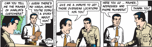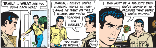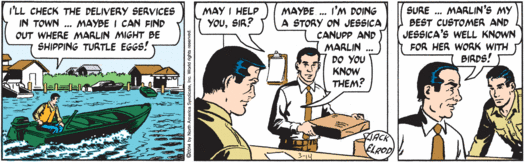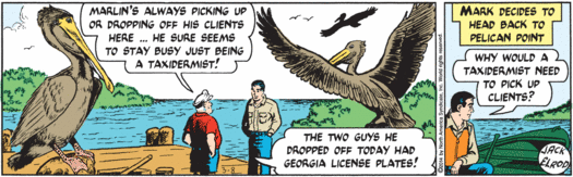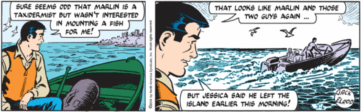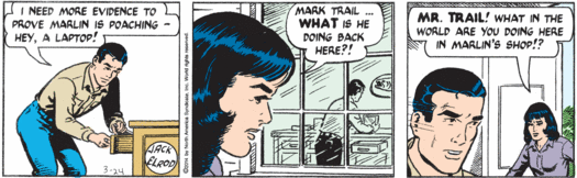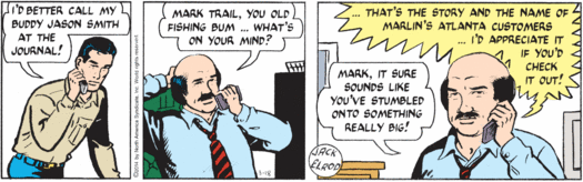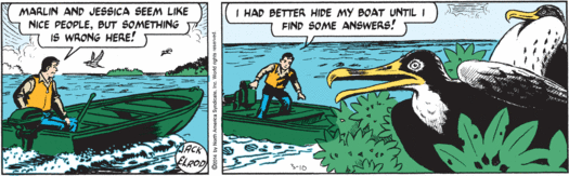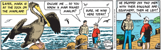 OK… we are back… and the abuses to privacy in the next three strips stagger the imagination. It’s a damn good thing Mark isn’t nosey about Marlin’s prostate, otherwise the local doctor would no doubt be spilling his guts on that topic… “Marlin? Sure I know him… but you should see his prostate… looks like an angry ugly-fruit…”