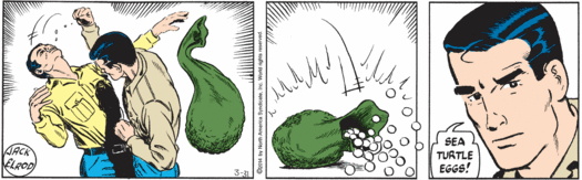 But where are we anyway? A branch of the USPS? A local shipping agent? And how does Mark “know” that Marlin is shipping turtle eggs? And to what end? Is this a racket where Marlin is filling the coolers and pantries of the world’s top chefs? “What will he do with the turtle eggs, Dave?” “Looks like he’s starting to separate them… Turtle egg white soufflé??”