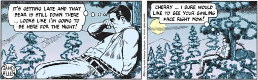 Meanwhile, back in the tree, Mark’s backside is growing impossibly numb as his opportunities to shift position are extremely limited… looks like he managed to shinny himself a little farther up that tree… He sure is in a pickle, though. Trusty dog back home, cell phone with improbable range and coverage is in the jeep, shirt now turned into a sling, exposing the left haymaker… looks like Mark might be sporting a wife-beater t-shirt…