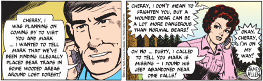 Well of course it’s an angry and unreasonable and wounded bear that keeps coming after Mark when clearly Mark did nothing to rile or threaten it… And the bear was wounded by… Poachers again! Well, I hope these are interesting poachers, since this is exactly the same entry point as the last 100 story arcs in the Trailverse… But some things have not changed. Dusty could have just called Mark, but instead planned to make a day out of delivering the news that there are poachers about… I mean, what else is there for a Ranger to do?