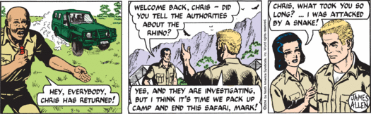 So, as we move this story along, will we ever turn up the bones of the guy that Mark flew down there to see in the first place? Will Mark be implicated in a smuggling ring now that he is unwittingly helping to ferry contraband? Will Lori ever get to play something other than the fair damsel, often in distress? What this strip needs is more strong women! Like Cherry! BLAM! Remember??
