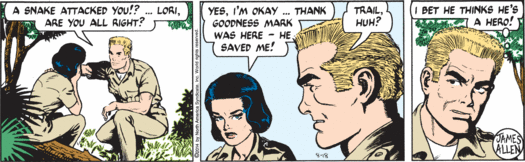 Oh Chris, you don’t know Mark like we know Mark do you? Being a “Hero” is all in a day’s work for him… he thinks little of it, the fact that he often inserts himself between life and death with little regard for his own safety. He knows better than any of us that this strip is named after him, and what would James Allen do if Mark were to suddenly come to an untimely end? Start writing a strip called “Rusty Trail?” I think not…