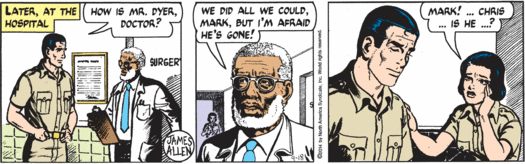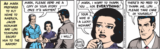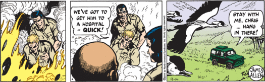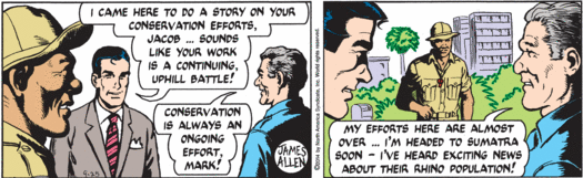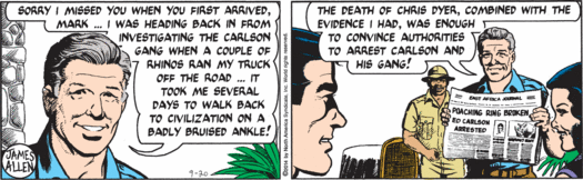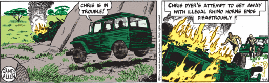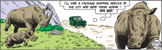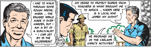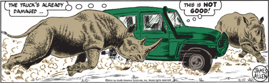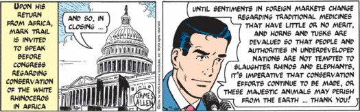 My goodness guys, it has been a while since Mark has seen his family, but sure, why not stop by Washington, D.C., on his way home and do a little testifying about animal poaching and then hobnob with actual congressman Trey Gowdy, who’s taking valuable time away from his job of chairing the House Select Committee on the Events Surrounding the 2012 Terrorist Attack in Benghazi to do a little rhino-horn chat! Why are real elected humans appearing in this strip all of the sudden, instead of random fake baldheaded senators? Well, it’s possible that Trey Gowdy is desperate to woo environmentalist constituents and overcome his extremely low scores from the League of Conservation Voters, and so has paid good money to appear in this tree-hugger comic strip. But Mark’s cutting aside about getting proper funding for any conservation effort probably means that isn’t the case, since Congressman Gowdy is super not in favor of the government spending money. So I have to assume that his carefully rendered face and somewhat too blond hair are appearing here primarily because “Gowdy” is an objectively hilarious name.