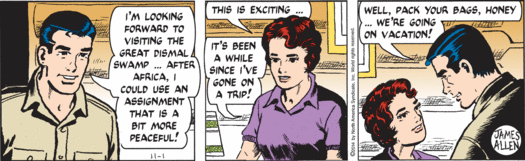 And Mark Trail is your pearl… or something like that. Girl, you need to get out more. What is it you do exactly while Mark is off on assignment? What is it about your past that determines your present and future? We could use a few Lost-style flashback sequences to help us better understand what we see unfold in the panels day by day… a few more thought balloons to reveal what is being thought when Mark says, “Well, pack your bags, honey …” The look on cherry’s face (if that IS Cherry- something’s wrong about her…) suggests thoughts along the lines of, “Keep smiling, keep smiling, this has to end at some point…”