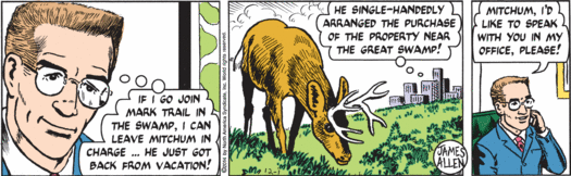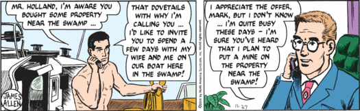 Mark, now so pleased with himself, his face so aglow with pure rapture that it’s drawing Cherry into the caper, we now get to see Justin Holland in his thoughtful and pensive state… And we soon get to be introduced to the real villain- Mitchum- who “single-handedly arranged the purchase of the property near the GREAT swamp…”
