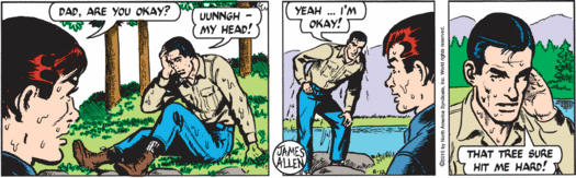 I am also happy to see that the new Mark Trail is not “drip-dry” like the old Mark Trail- at least he still has water sheeting off of him in panel three… but his hair is still impervious to water and other forms of messing with it… Still, the least you can do, Mark, is thank your “son” for dragging your enviro-ass out of the water…