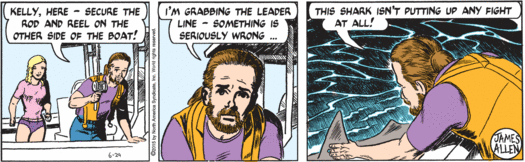 Such sadness and concern from Ken… the shark is fully submitting to his obvious and apparent dominance, and this isn’t what he had in mind at all! No-sir-ee-bob! Well at least we now have a mystery on our hands… but how on earth do we connect Mark Trail to this? What good would a wildlife feature writer have to offer this situation?? Safety tips? Fashion sense? Let’s stay tuned…