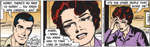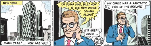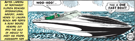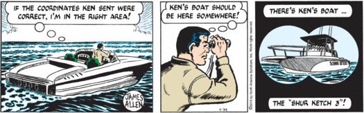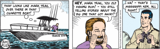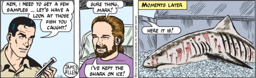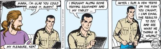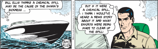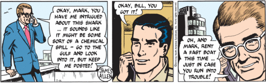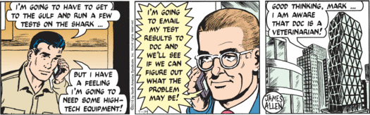 Is that a microscope in panel one? Part of the “special equipment” that Mark brought to use in this investigation? CSI Trail? So what’s Doc going to think? “I don’t know Mark, looks like blood to me… maybe shark blood.”