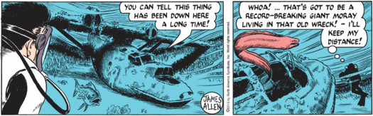 It would appear that whatever is causing the shark to ulcerate is also giving the Moray Eel in panel two a creepy-pink, spam-like glow…