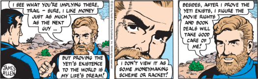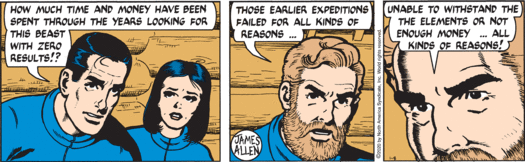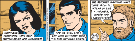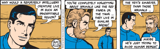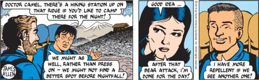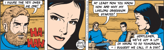 … but once again, let’s take stock… there have always been 4 tents (the bulk and configuration of which is still utterly laughable; they are no doubt still sleeping on cots…) but now we realize that Genie and Dr. Camel are probably sharing and the Sherpa(s) each get there own? The Tent says, “I can’t believe it, Genie” which has to be (?) Dr. Camel, right? And Apparently a snow leopard has been dogging (catting) their steps?