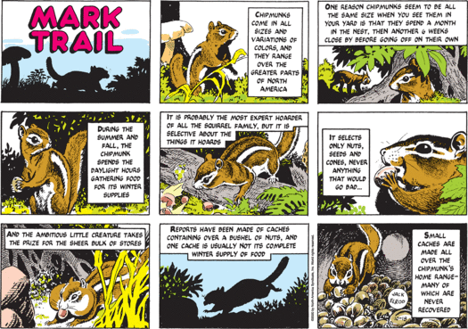 I normally don’t check the Sunday offering, but out of curiosity (and as pointed out by Faithful Reader George) I was wondering about what this part of the Trailverse would look like, and here we find Jack Elrod’s take on the common Chipmunk (part of the Squirrel family?) auditioning for a Lifetime special on hoarding.