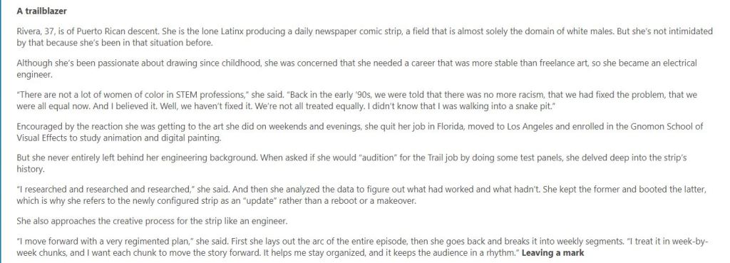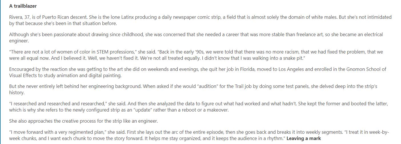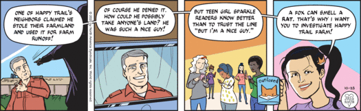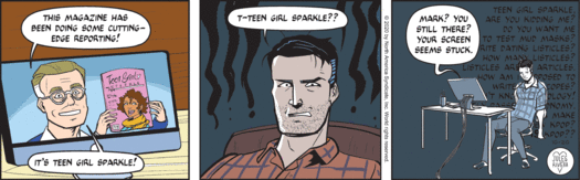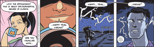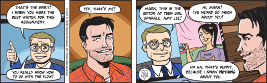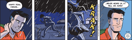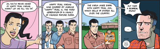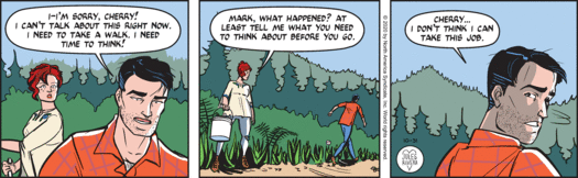 But here’s a question… How do we go from the black-tie awards ceremony back to the office on Park Avenue? Unless the last strip (from yesterday) was actually “the next day” and Cherry and Rusty were still laying rose petals at Mark’s feet… Only to have Bill Ellis call Mark at Lost Forest from the office? I know, I over-think these things, but I hope that Jules Rivera spends a little more time ensuring continuity than history would demonstrate. Or then, maybe that’s part of the Trailverse I will end up missing most?