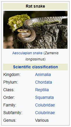 Rat Snakes, are members – along with kingsnakes, milk snakes, vine snakes and indigo snakes – of the subfamily Colubrinae of the family Colubridae. They are medium to large constrictors and are found throughout much of the Northern Hemisphere. They feed primarily on rodents. Many species make attractive and docile pets and one, the corn snake, is one of the most popular reptile pets in the world. As with all snakes, they can be defensive when approached too closely, handled, or restrained, but bites are not serious. Like nearly all colubrids, rat snakes pose no threat to humans. Rat snakes were long believed to be completely nonvenomous, but recent studies have shown that some Old World species do possess small amounts of venom, though the amount is negligible relative to humans.