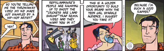 Eco Rapper? How about eco-wrapper? Reptiliannaire? That’s difficult to spell. He looks like a deranged Leprechaun. Well, ’tis the season after all. Pi-Day (3.14) followed by St. Patrick’s (3/17) who drove the rats from Ireland…
