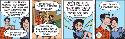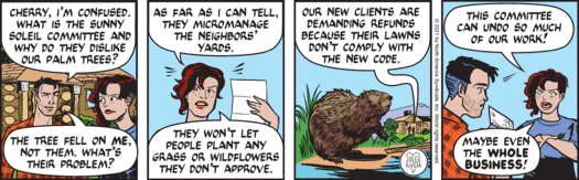 On to the domestic bliss of the work-a-day, own-a-business life… Cherry receives a missive from the local Homeowners’ Association. If ever there was an assault on private property rights, its initials are HOA…