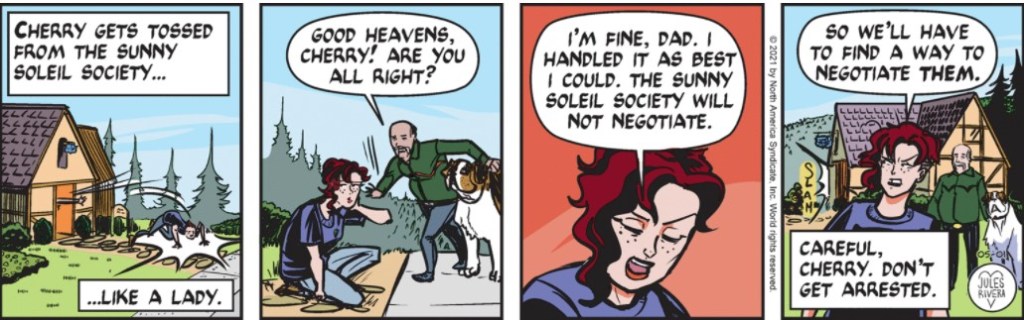 As the door to the Society gets slammed shut, Cherry makes a tactical retreat and considers a more persuasive strategy. But what can she do? Don’t know about you, but I’m not taking Rivera’s bait in panel four again.