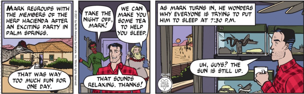 Mark certainly does look beat in panel three, unless it is the tea. And it looks like he is once again bunking with the snakes. Still, Mark should be suspicious, especially when the narrator prompts you! With the Sun still up at 7:30, this places the story in late May, based on the tables in the Sunrise-Sunset.org web site. Just in case you wanted to know.