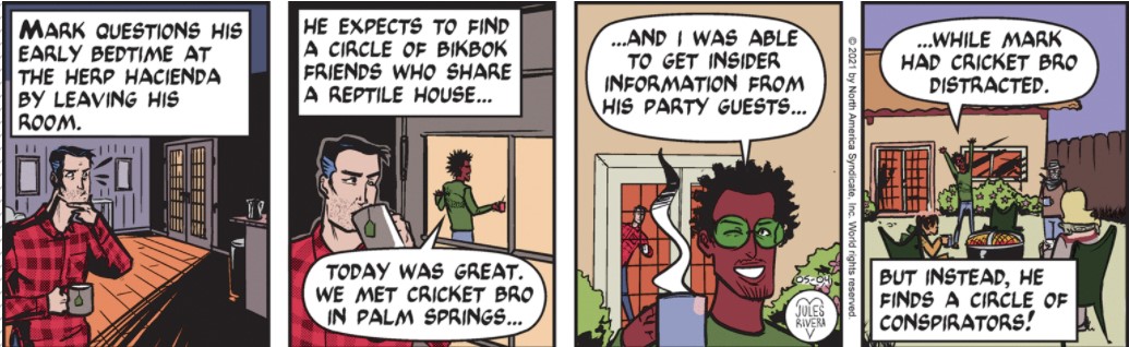 Well, Juliet it beith not; yet doth the plot turn. And here, I was thinking Reptilionnaire might be in cahoots with Cricket Bro, or just a sidebar to the ever-changing focus of this story. Not only did Cricket Bro (aka Rob Bettancourt, the childhood frenemy of Mark, who just happens to be involved in this whole cricket protein racket) take advantage of Mark, but so has Rep. Like an old Mark Trail storyline, Rivera has already throwing several red herrings at us, with abrupt transitions and missing scenes (the unseen video shoot, itself; whether Mark took that card from Cricket Bro; whether Mark ever retrieved his smart phone, etc.).