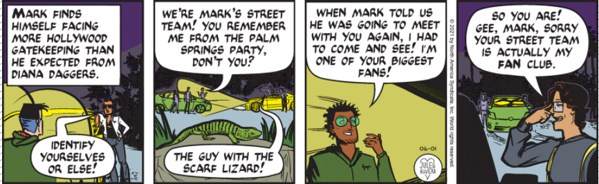 Aside from what, I think, is an alligator lizard in panel 2, I can’t figure this out, unless it is some kind of in-joke. “Hollywood gatekeeping” is slang for guardians of movie making, star making, etc. They could be professional movie producers, for example, previewing scripts for proposed movies; or agents, looking for whatever the current type happens to be in fashion. More generally, it could refer to self-appointed trustees of whatever brand, object, or genre a gatekeeper claims to know more about than you, such as Trailheads intent on maintaining what they believe to be the only proper and valid version of Mark Trail. Or they could be a hardcore fan of a particular band and want you to know it!  Thus, their aim would be to assess whether you have the proper knowledge to also be an accepted hardcore fan. For example, what is the name and release date of the 7th album by The Black Keys? And who were the producers? Which guitar did Dan Auerbach use on track 6? Don’t know the answers? Go home, poser!