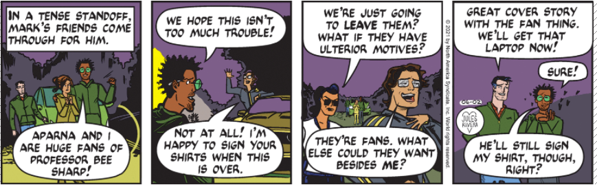 We can expect Mark will make it to Cricket Bro’s mansion. What happens after that is a subject for another day. And we have three more days of strips this week to get Mark there.  So far, it has taken eight days of strips for Mark just to drive “half-way” (an educated guess), which means we might as well be watching an episode of 24. In spite of that, I have to admit that the story does not seem to be dragging. Confusing, yes. Anyway, it might be time for another Mark Trail Time Lapse to occur, where the Thursday strip finds the crew already inside Cricket Bro’s house, confronting the insect entrepreneur, himself.