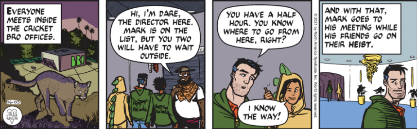 We meet another oddball, a gatekeeper/bouncer named “Dare” (pronunciation up for grabs), who meets them in the lobby (I suppose). Dare conveniently separates Mark from his posse/street team, so they can leisurely “sneak” into the Developer’s wing, somehow without the gatekeeper seeing them or hearing Mark give them a caution. Perhaps Dare was a trusting soul who immediately turned to open the door to escort Mark into the presence of Cricket Bro. Seems a bit reckless for a doorman, though. Still, I wonder why Rivera did not try to show them whispering, something like this?