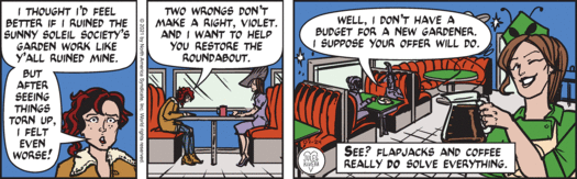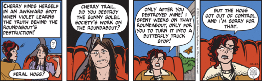 Okay, we must allow Jules to have her joke. Where is it? It is the 4th panel, where everybody is having some kind of vocal group hug and the speech balloon points to Mark, though the text seems to be something the other four would be telling Mark! Trailheads sometimes speak of older strips where dialog balloons on occasion seem to point to the wrong person, or thing. I admit that I was too lazy and tired to look through the backlog of strips, so feel free to add some footnotes in a response. In any event, it seems odd that Mark would be welcoming himself to Herp Hacienda, unless this is meant to be some kind of campy commercial where Mark and crew are actually welcoming us readers to come back. Well, thanks anyway.