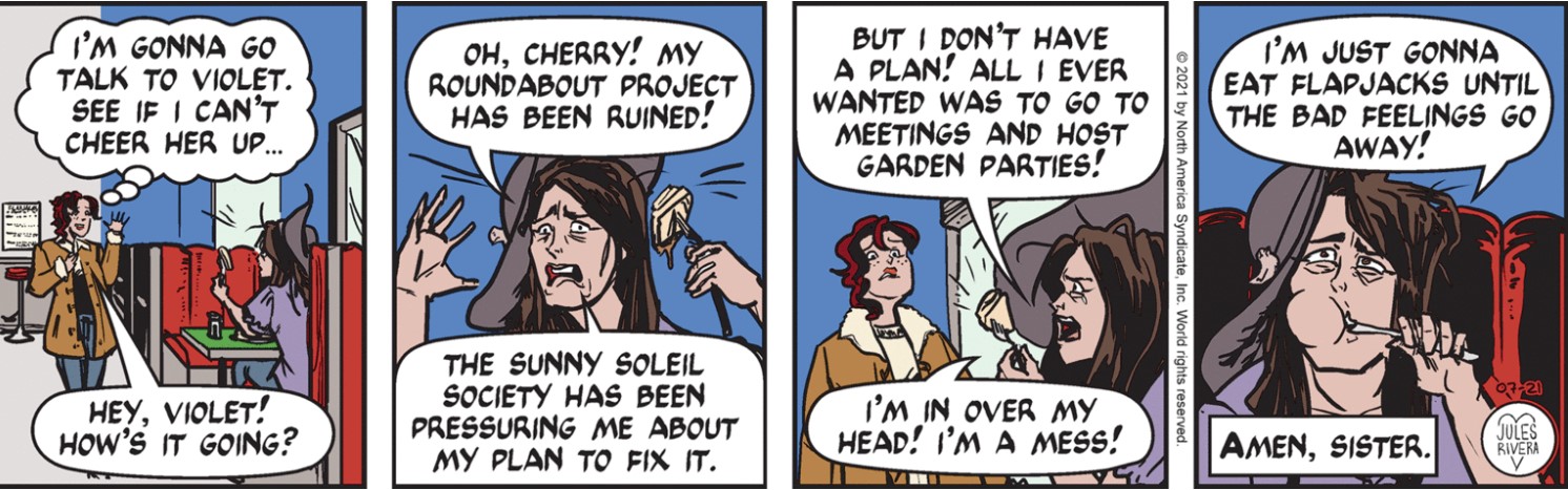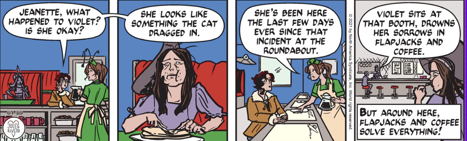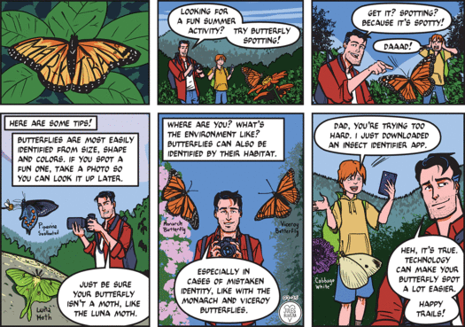 I think many of us will agree that this is not the strongest ending to a Mark Trail story, though it is not much worse, either. Aside from the dodgy animal air check app, this story seemed to be a series of unresolved, random vignettes. I’ve never been a professional comic strip artist, but I’ve played one in my head, and I know that there can be tremendous pressure to put out a 7-day comic strip. In fact, have we not seen other cartoonists these days going on hiatus every so often, content to rerun older strips in order to get away from the pressure? Or, perhaps to catch up? And perhaps Rivera deliberately constructed this story in a way that would mimic or rip some Mark Trail story memes sure to raise the blood pressure of Trailheads. Or, maybe Rivera is just ripping the old-fashioned notion that a Mark Trail story should follow conventional norms.