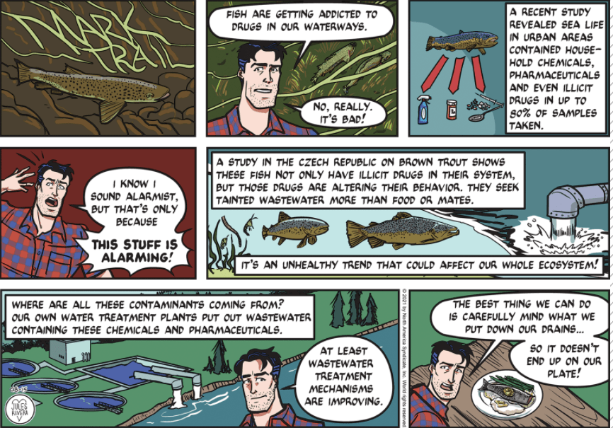 Rivera makes several fast cuts in these four panels, changing the angles, space, and proximity, just to keep things moving along. The third panel, as seen from a space behind the two riders, but ‘outside’ of the car, is a nice inventive viewpoint, though I have to take issue with those front seats, which look like they were carved from wood. Mark must have rented one of the “base” models of that car. And though I did not mention it before, that shoulder belt in the last panel of Monday’s strip looks more like a towel or maybe even a large piece of tree bark. But, I’m carping over details again.
