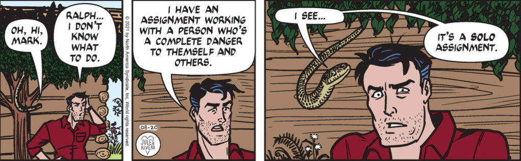 Okay, I think this is one of the more interesting starts for Mark’s new adventures. Aside from Dagger’s “Welcome to Hollywood” remark, I’m still not sure where they are. If they are in California, why did Mark pick Diana up at the airport, rather than the other way around? Otherwise, what is the reason for Diana’s closing comment? I don’t think that Barn Owl knows (and remember, Rivera already covered owls on a Sunday in the early days of the California adventure, so I don’t think we’ll see it on Sunday).