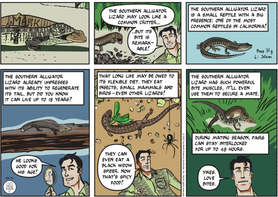 Anyway, there is one thing I wish Rivera would expand: Subject matter. For the most part, it seems that the Sunday strip always focuses on animals. All well and good, but Mark’s universe is supposedly all of nature, so how about devoting some ink and color to the flora and geology? Maybe even branch out to themes, such as what can happen when people build/encroach on beach fronts, hills, or dense forests. That could even make the basis for some interesting story lines for Mark. How about it, Jules?