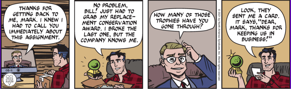 As for the art today…well, Bill’s image in panel 3 is markedly jagged and unevenly constructed, as if the head was glued down in the wrong position. Frankly, he reminds me of old-fashioned wooden marionettes, like you can see on the English “Thunderbirds” TV series. As for Mark, I think we have to accept the fact that Mark’s unkempt hair is always going to be that way; a thumb in the eye to the prior Mark and what I describe as a pomaded side-slicked haircut and spit curl.  And I’m okay with that! As for the drawing of the award, it looks like it was designed to be in Pearls Before Swine. I reckon that it is supposed to be some kind of glass ball on a brass stand, but looks more like a balloon glued to the top of an old-fashioned inkwell.
