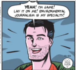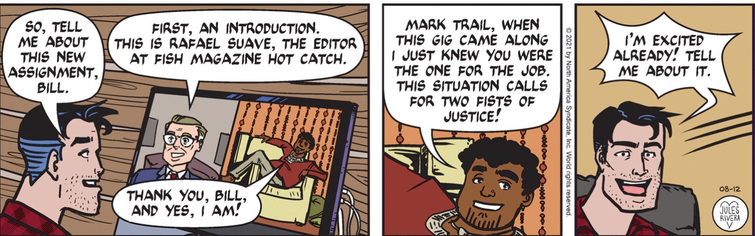 Well, I don’t think I need to go too far out on a limb and suggest that, based on Mark’s over-reactive response in panel 4, Mark might be getting set up once again for some oddball assignment. But, hey…this time it is a fishing magazine…I think. And maybe Rafael is an actual angler. No reason to presume not, even if he’s not wearing a hat covered in trout lures and sitting in a boat. As with Amy Lee, I’m thinking “editor” means “Editor in Chief”, so Mark is getting his assignment straight from the top, not some feature editor.