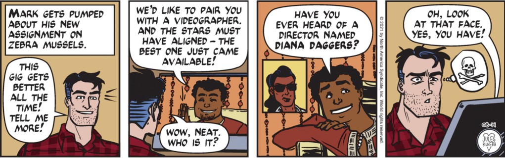 In any event, this twist should make for an interesting story, don’t you think? Maybe zebra mussels will, indeed, become less of the focus. But I have to admit it: Mark’s expression in panel 4 is priceless! Well done, Rivera.