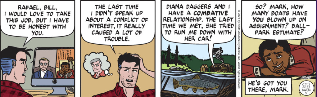 Then again, Rivera, must you continue to use this hackneyed meme every time a new story line is introduced? Are all of these magazine editors going to be narcissistic sociopaths who blackmail Mark into accepting outlandish assignments? Or perhaps this is really Bill’s long-term act of revenge against Mark for bankrupting his magazine after paying off lawsuits and having to cover all of the property damage Mark caused in his career. That, and forcing Bill’s magazine to sell out to a conglomerate and reducing Bill’s job to a meaningless, impotent intermediary.