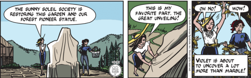 Back to the unveiling, it seems that this statue must have also been restored or replaced, if this is a proper unveiling. And where is the rest of the staff for such an important moment? The only other person belonging to this association that I recall is a middle-aged man in a kitchen that we saw in one daily strip back just after Violet tossed Cherry out on her ear. But that was about it. Who he was or what his job was is a mystery, except maybe as a springboard to help move the plot along.