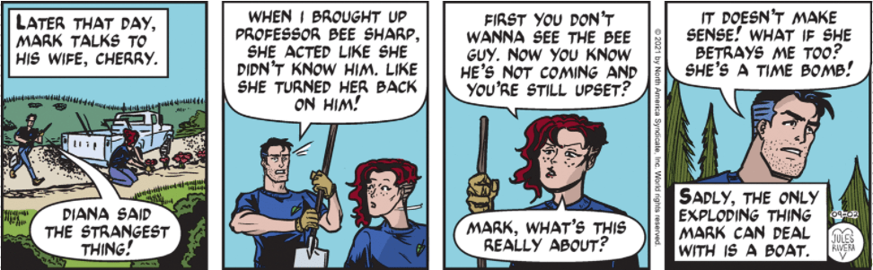 Luckily, Mark not only has a snake to help work out his feelings of doubt, he has his life-mate, Cherry. And she is not going to let him slide by. While some might call this more classic story padding, it is really plot development: Not in action but in motivation and causation. The earlier version of Mark Trail tended to keep Mark’s concerns and feelings fairly basic and easy to figure out: Aloof—check. Curious—check. Angry—check. Bemused—check. Now Mark’s feelings are more nuanced, if not sometimes stuck between shifting gears.