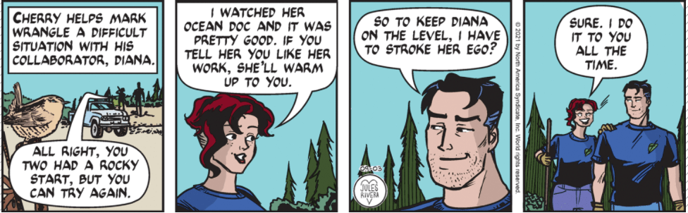 Rivera has been criticized for injecting too much humor into the strip, as if it were a standard gag-a-day comic. I’m not going to go through all of her strips to date to see if that is quantitatively true, because I believe the criticism is more based on perception. In an otherwise serious adventure strip, humor stands out. I believe the term for movies and tv shows like this is dramedy, something combining drama and comedy, but in more of an organic manner. That would be shows like Ally McBeal, Six Feet Under, and more recently The Marvelous Mrs. Maisel, Orville, and The Ranch. You could probably name 20 more, as I don’t watch that much TV. Anyway, my point is that I believe this is the approach that Jules Rivera has taken with Mark Trail: A basic adventure strip, with comedic or absurdist elements. Early on in Rivera’s tenure, I made a connection between her and the off-beat crime drama books of Carl Hiaasen. She read that remark I made and agreed.