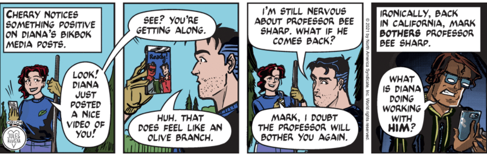 Well, with all the handwringing, I feel like I’m losing track of the story, which has still hardly gotten off the ground. If Rivera follows her standard practice we’ll see a second week of Mark’s story. Perhaps we will also see some movement in the storyline. And let’s be done for now with the self-doubts and feel-good therapy. Jules, the comics page does not need another soap opera strip!