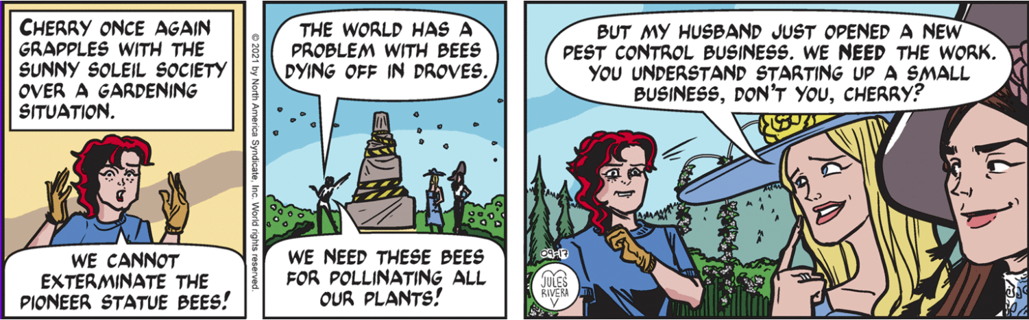 Visually, today’s strip is well-designed and nicely illustrated, showing little of the “I-have-a-deadline!” sketchiness we have seen other times. By well-designed, I mean that the composition in each panel nicely highlights and supports each panel’s dialog: Panel 1 focuses on Cherry as she states her position, with nothing extraneous to distract us. Panel 2 brings in the statue and bees, along with the three women, as Cherry’s argument moves from a global view of bees to their importance to their local garden. And panel 3 provides a dramatic “oh, by the way” objection by the Sunny Soleil Society to Cherry’s argument. Thus, the two Association women take prominence, as Cherry (and her position) is “pushed” towards the background. I like panel 3, as Rivera’s drawing of the Sunny So-Ladies, as they give us a visual window into their souls (or attitudes).