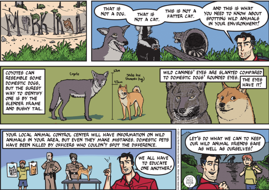 So, exactly what can we do to help keep wild animals and ourselves safe from each other’s less-than-noble desires to kill each other? I think focusing more on Mark’s closing comment would have made a better, more informative Sunday strip. So, who is really surprised if a minimum-wage animal control employee shoots somebody’s collie because he thought it was a wolf? We’d rather learn how to protect our pets from those people! It’s not our job to train them, anyway. And what do we do when we are installing a walkway in the backyard and a black bear or fox suddenly shows up? Do we heave pavers at them?