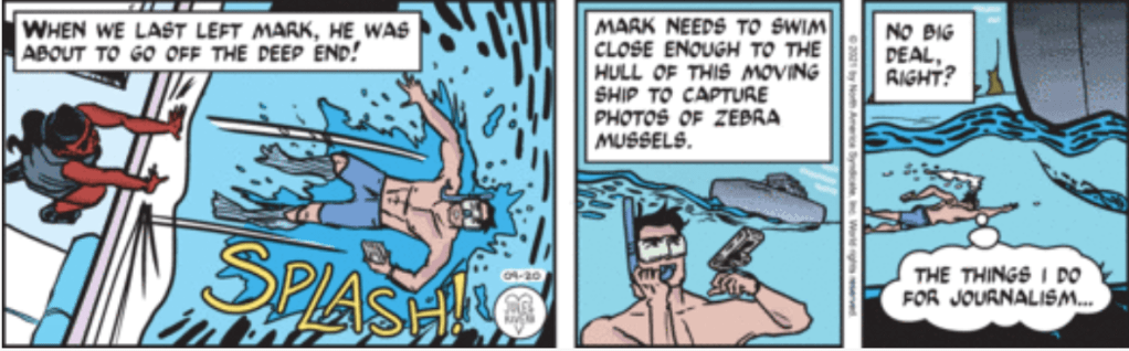 One thing I am curious about is the slender gray object in the background of panel 3, between the ship’s hull and the comment box (“No big deal, right”). It appears to me that it’s an approaching ship. So, the danger will soon increase, as Mark must not only avoid getting turned into sausage from the propellers of this ship, but avoid getting sucked under the approaching vessel.  Especially if he does not notice it in time! And I don’t believe ship hulls have handgrips under the water line, either.